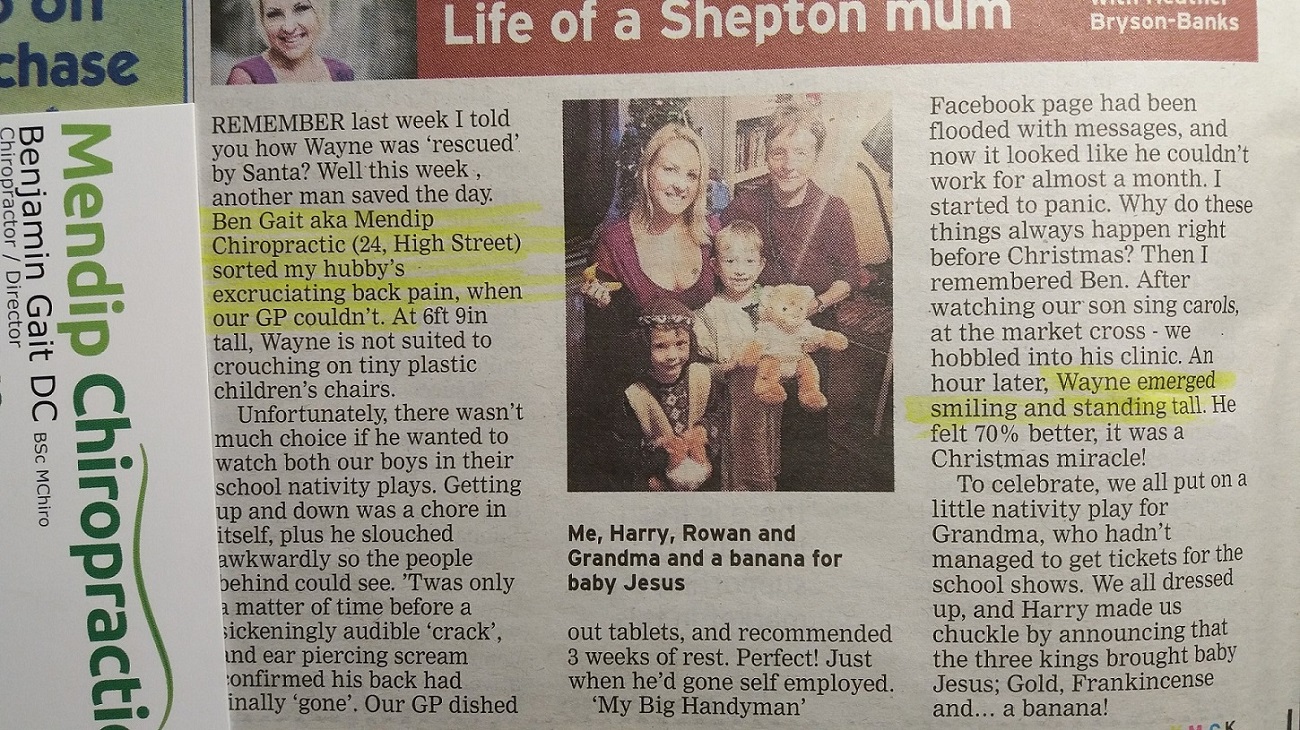 It is an absolute privilege to be able to help someone in difficulty as highlighted in this news clipping from last year. Gradually people are coming to understand the role Chiropractors can play in the healthcare system and especially with symptoms such as a backache. But that does not mean your GP understands or follows the current NICE guidelines. Sadly there is one GP practice in Shepton Mallet that tells their patients not to see a chiropractor! I won’t name names yet although I should because the other practice has been a little more cooperative. We have GP’s and retired GP’s that use our services with satisfaction. Sadly I doubt that the negative influencers have much understanding of what we do.